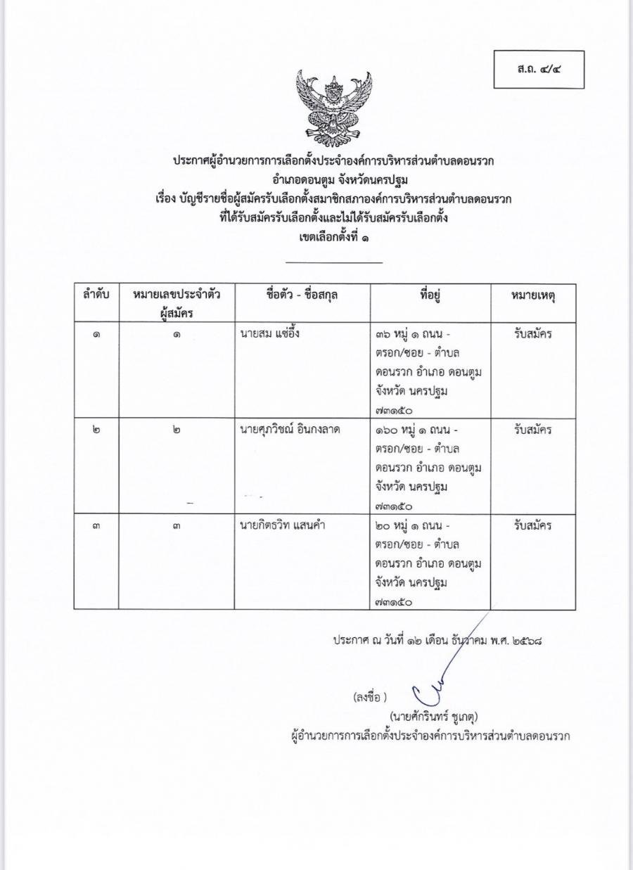 บัญชีรายชื่อผู้สมัครรับเลือกตั้งสมาชิกสภาองค์การบริหารส่วนตำบลดอนรวกและนายกองค์การบริหารส่วนตำบลดอนรวก