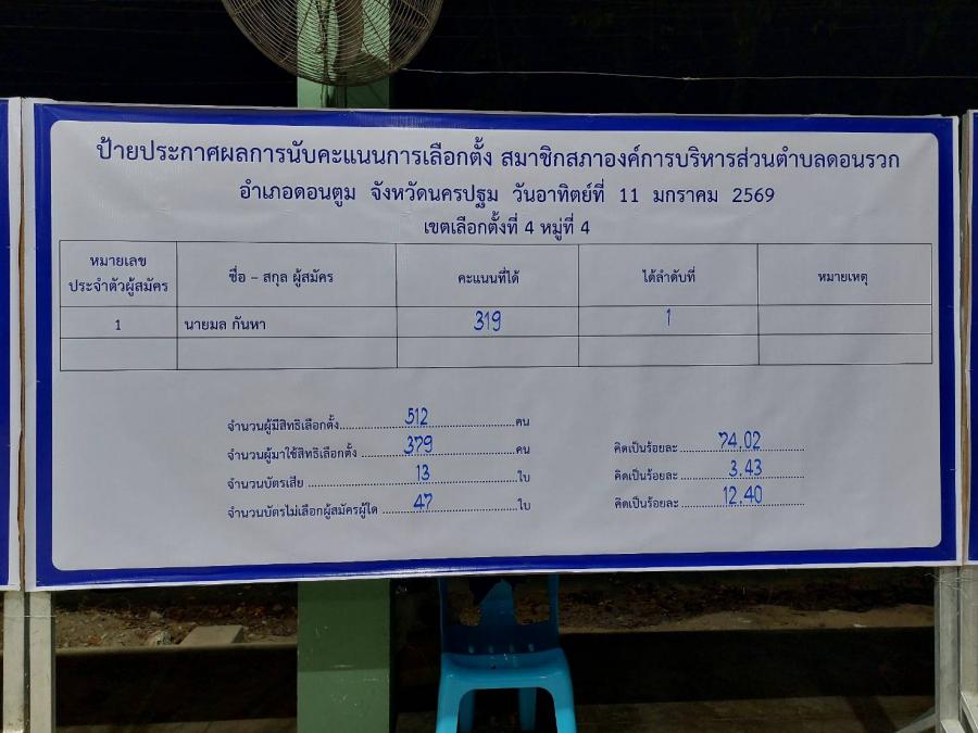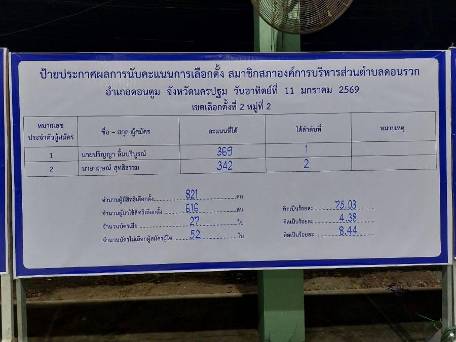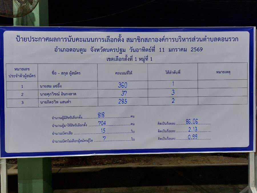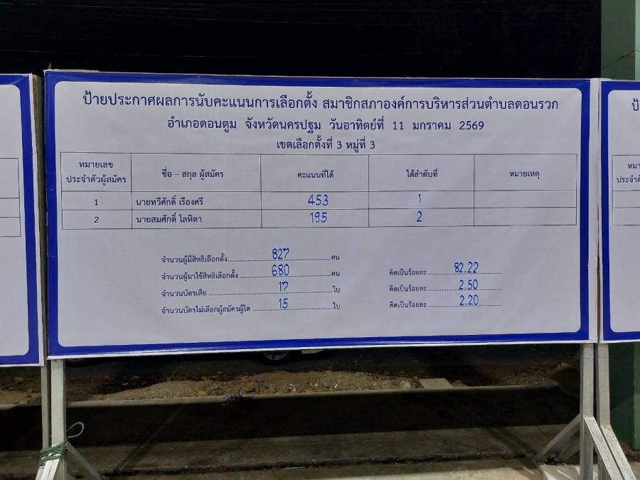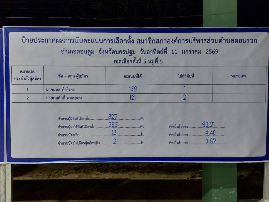 สรุปผลคะแนน จากการเลือกตั้งนายกและสมาชิกสภาฯ อบต.ดอนรวก อำเภอดอนตูม จ.นครปฐม เมื่อวันที่ 11 มกราคม 2569